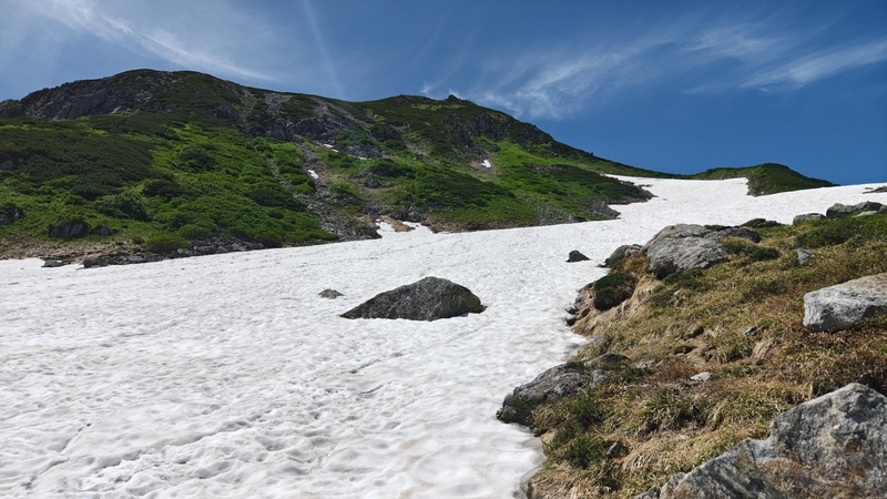 雪渓をヒヤヒヤしながら横切る。